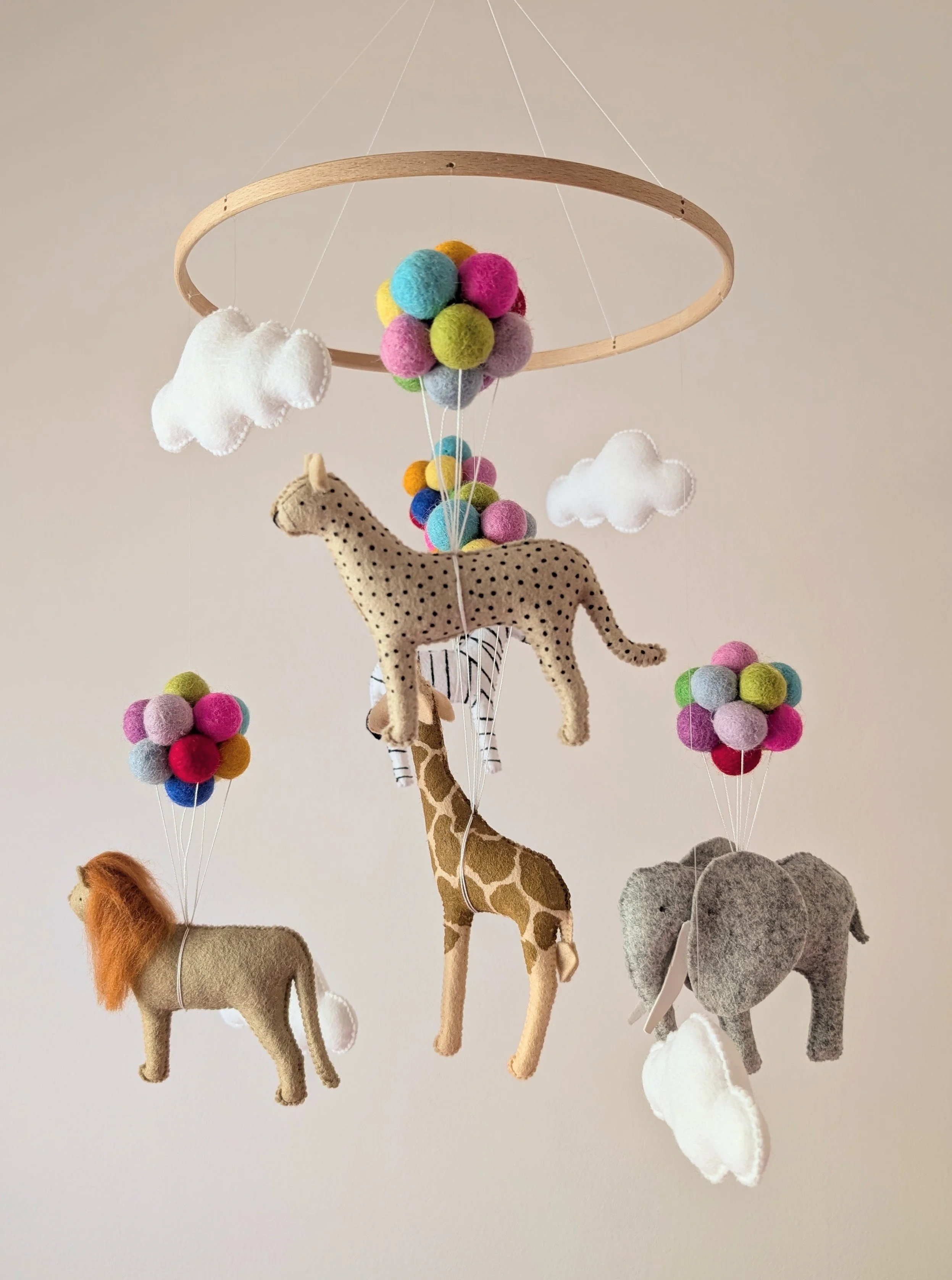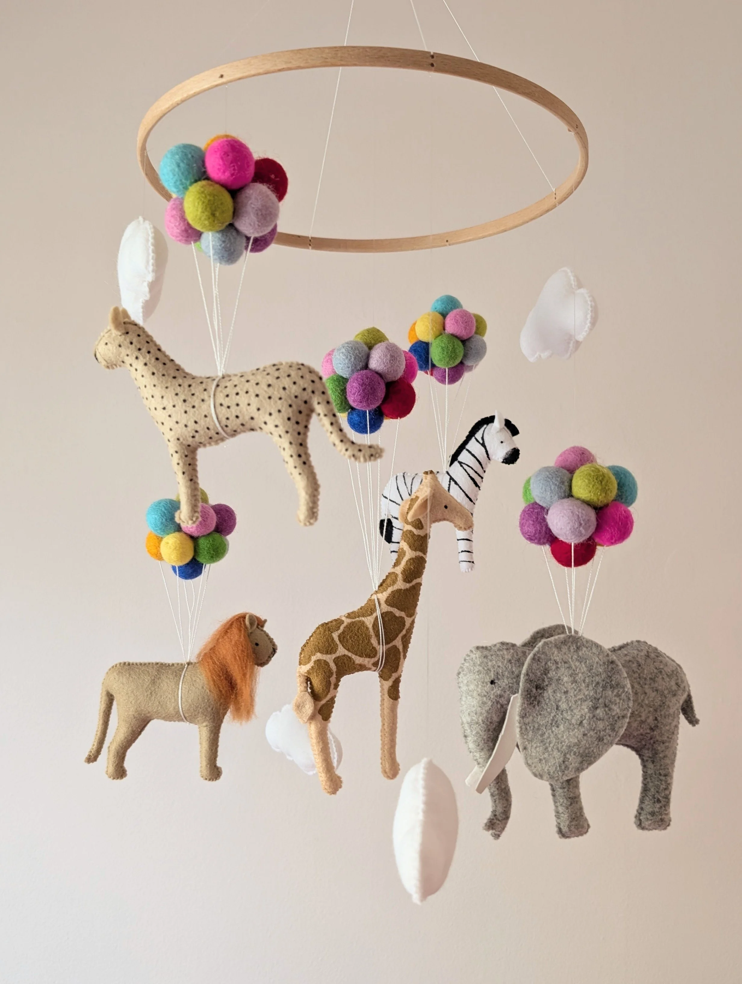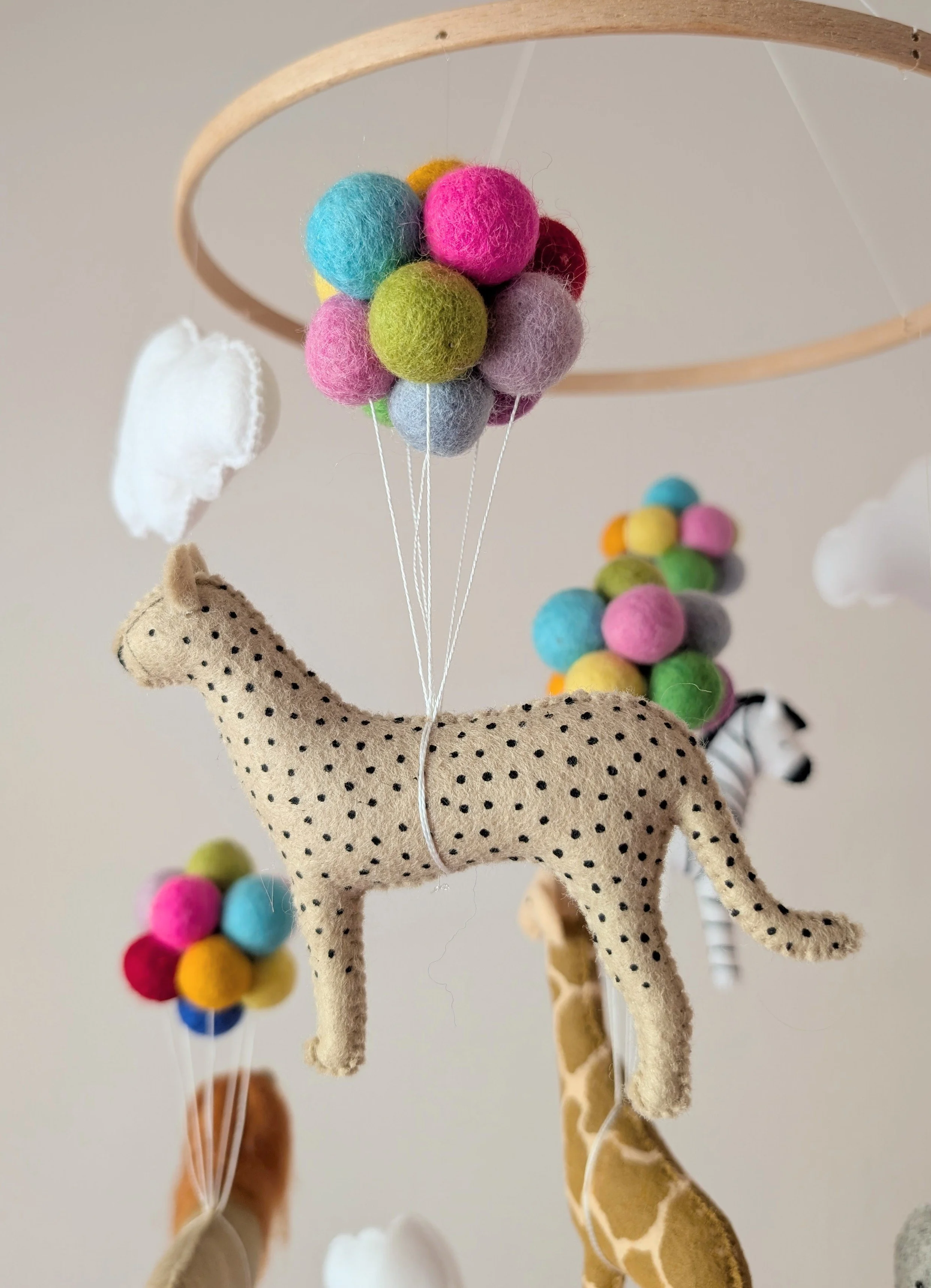 The gorgeous balloon safari mobile features a zebra, cheetah, elephant, lion and giraffe effortlessly floating in the sky with a colourful array of balloons.