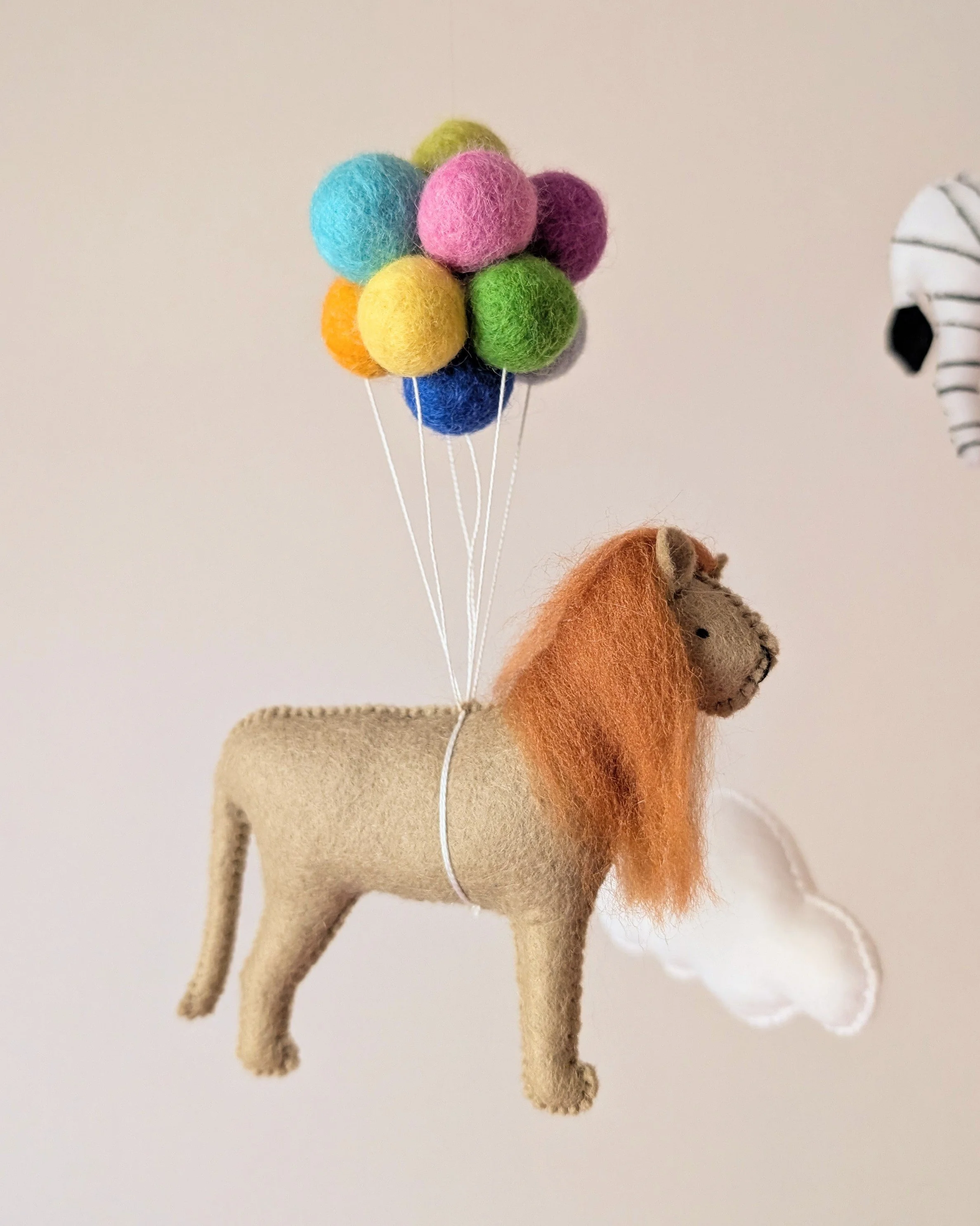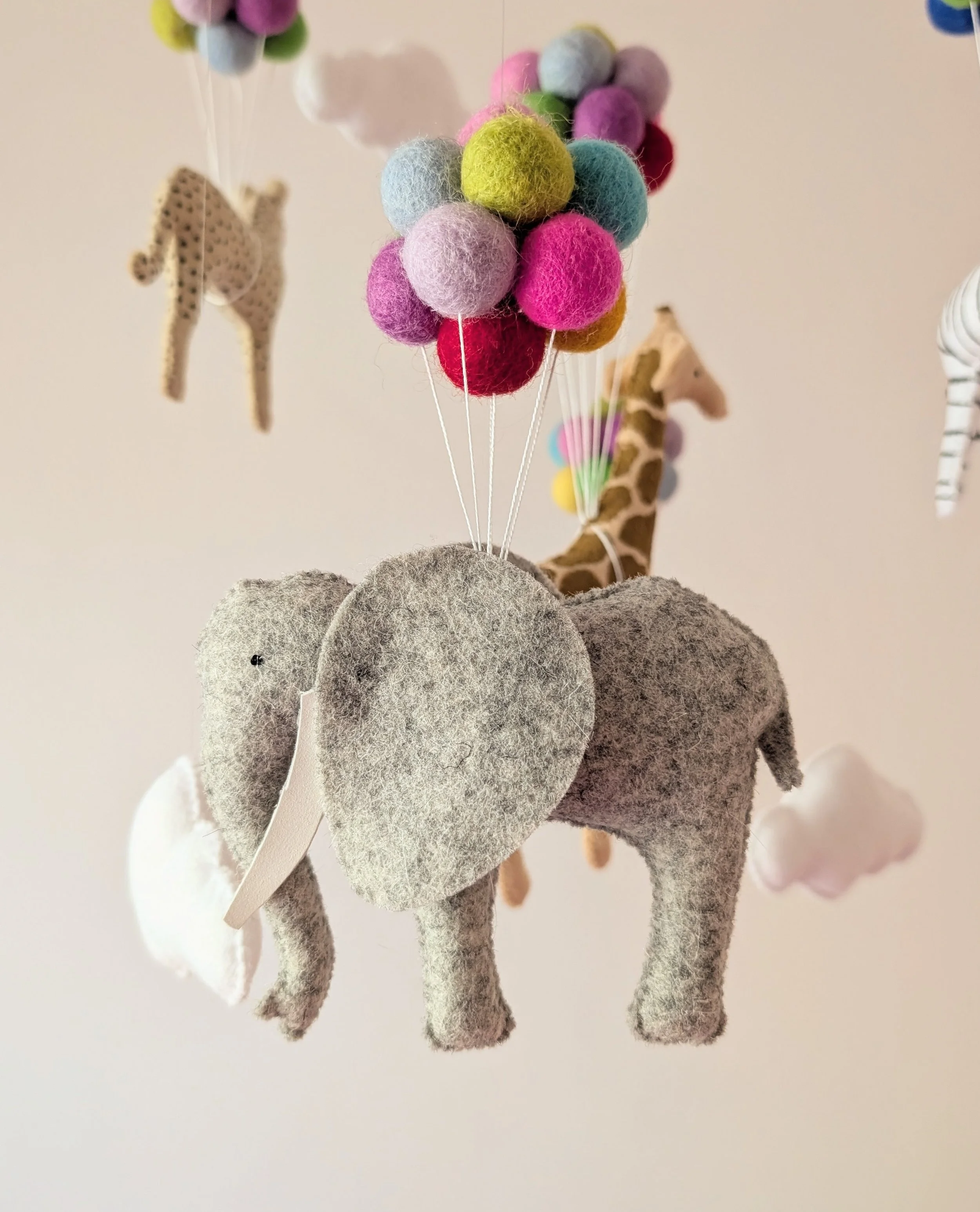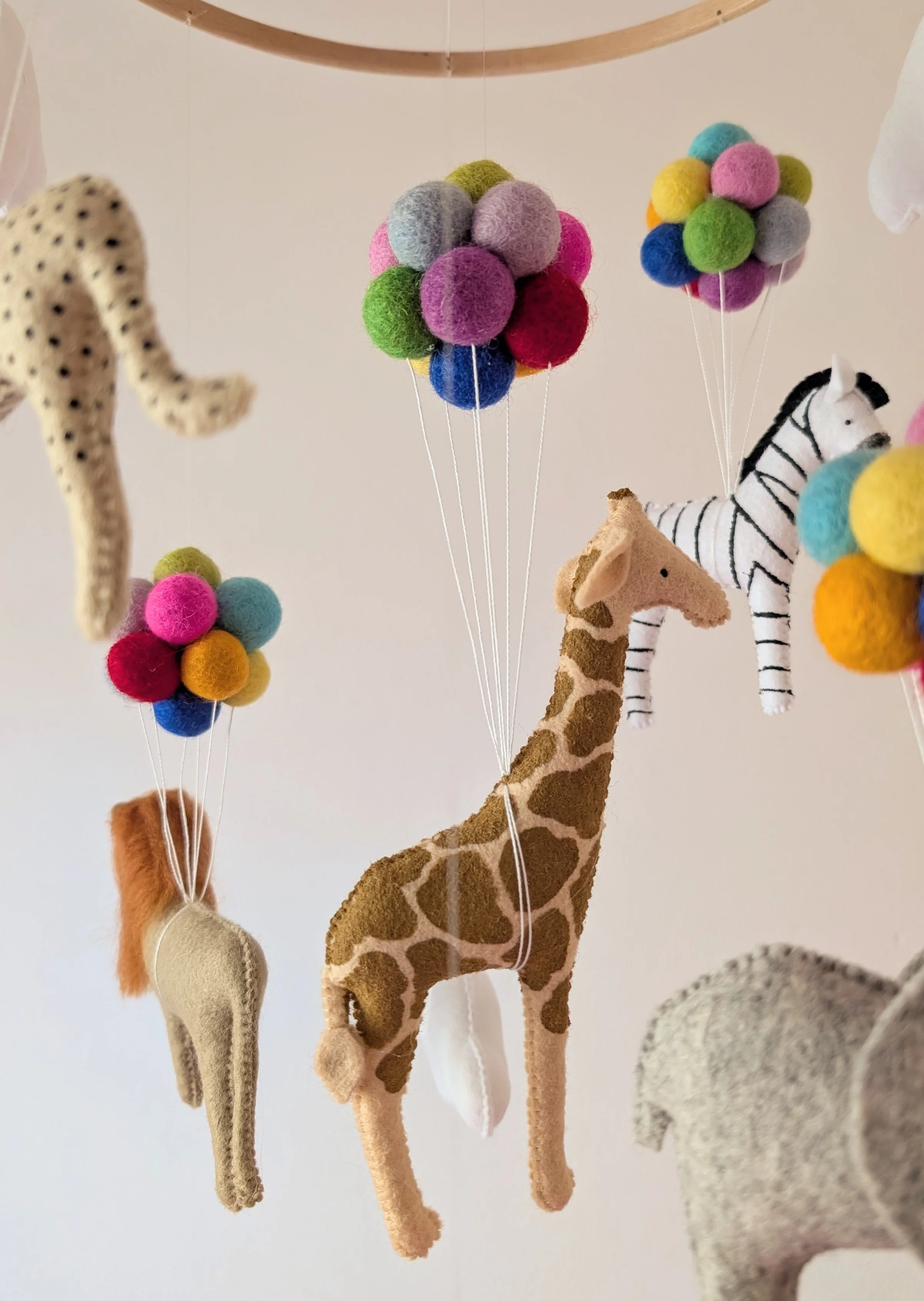 The gorgeous balloon safari mobile features a zebra, cheetah, elephant, lion and giraffe effortlessly floating in the sky with a colourful array of balloons.
